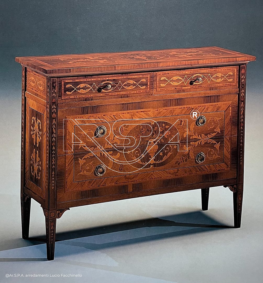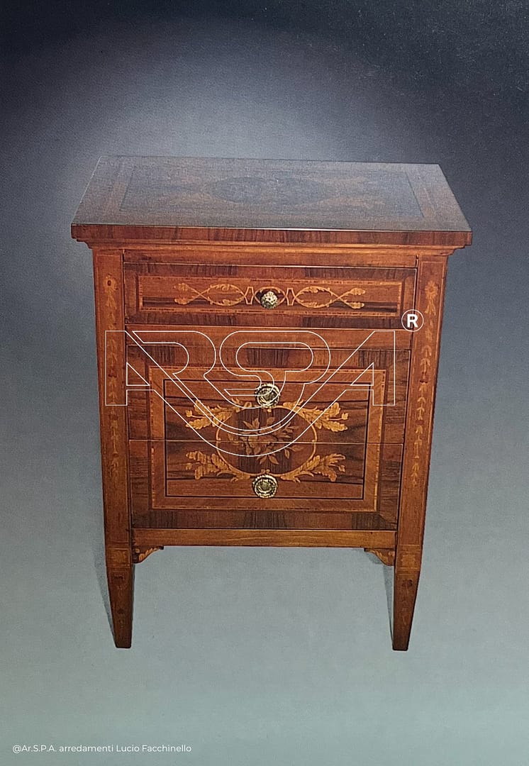 Set con comò (116 x 40 x 90 cm) e comodino (53 x 35 x 71 cm) con dettagli intarsati.